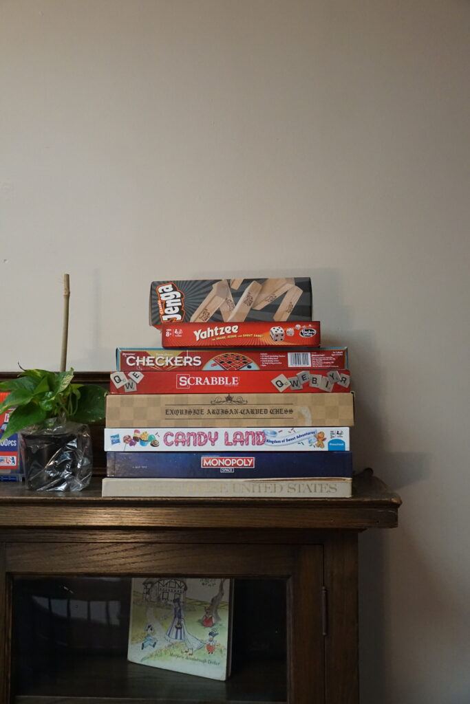 Although each room is supplied with towels prior to guest arrival, guests are able to get more towels at their own convenience from a cabinet on the second floor landing. Additionally, guests are provided with a variety of board games as seen on the shelf above, as well as throughout the home.